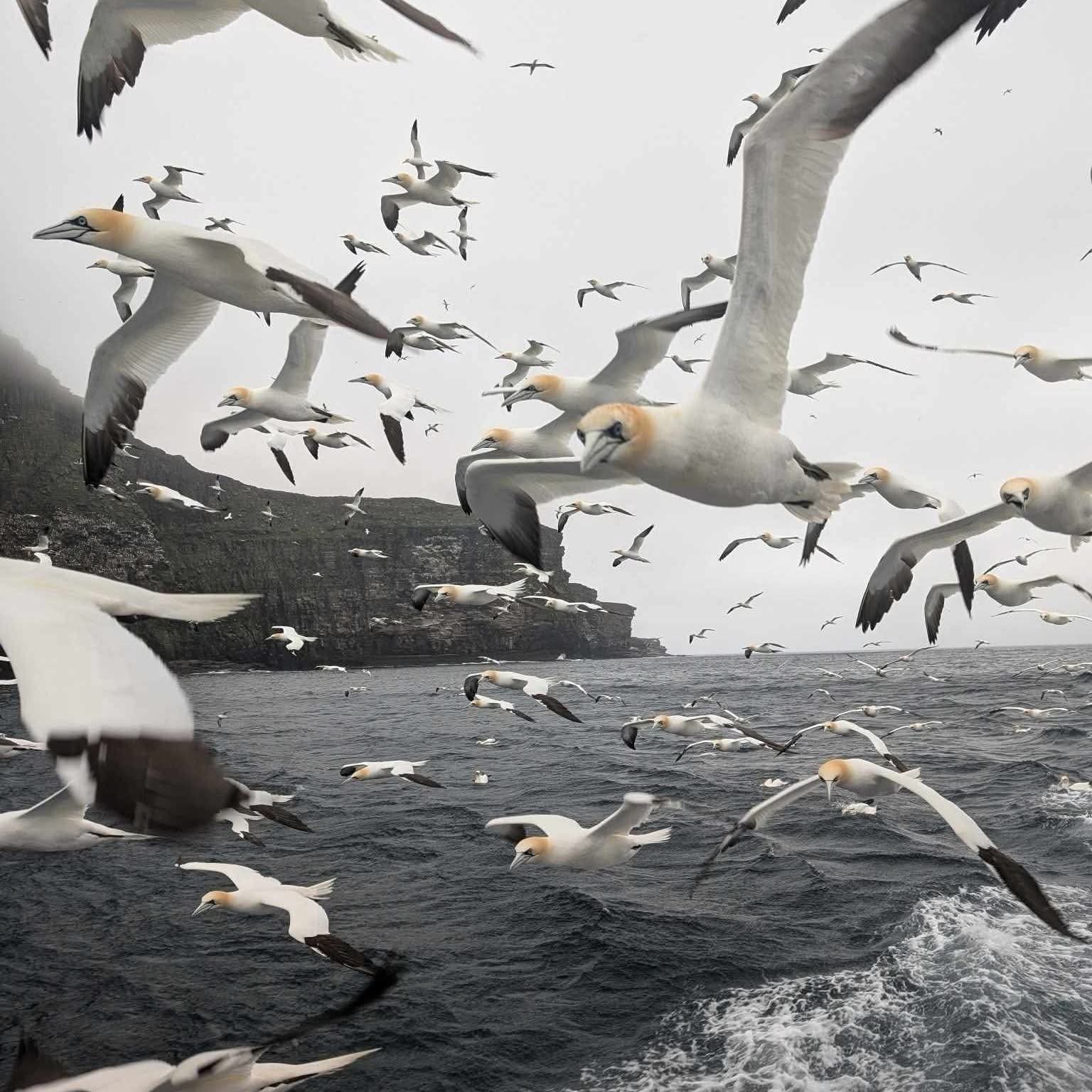 The tour takes you right around Bressay & around the cliffs of the famous Noss National Nature Reserve. Our trip to Noss is an amazing wildlife spectacle and allows you to enjoy Shetland’s plethora of seabirds and seals, as well as spectacular views. We’ll take you unbelievably close to the awe-inspiring sights and sounds of this extraordinary seabird metropolis, which is home to 25,000 Northern gannets, as well as thousands of guillemots, black guillemots, puffins, razorbills, gulls, shags and skuas. You will come eye-to-eye with beautiful blue-eyed gannets and immerse yourself in the unforgettable clamour of a thousands-strong ‘choir’ or different bird calls – a sound you’ll never forget. Superb opportunities to see and photograph Shetland’s wildlife against the stunning backdrop of the 181-metre-high Noss sandstone cliffs. We bring along fresh fish to give you a guaranteed opportunity to see gannets encircling and diving right alongside our boat…always a great highlight.